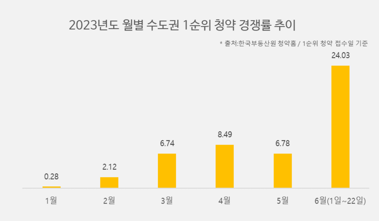 특히, 6월에는 2,027가구 모집에 4만8718건의 1순위 통장이 몰리며 24.03대 1의 경쟁률을 기록했다. 아직 6월 청약 일정이 남이 있는 점을 고려하면 이달 청약 경쟁률은 더 뛸 것으로 전망된다.