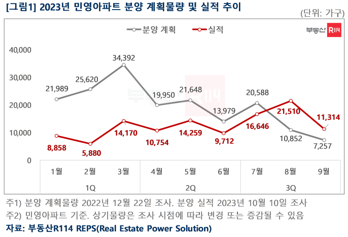 올해 마지막 분기를 남겨둔 시점에서 연말까지 약 8만여가구의 민영아파트가 분양될 예정이다. 1~3분기 분양 실적과 합치면 2023년 총 공급량은 20만 가구를 밑도는 수준에 그칠 것으로 예측된다. 2013년 20만281가구 이후 10년 만에 민영아파트 최저 물량을 기록할 가능성이 높다. 청약 훈풍에 힘입어 수도권을 중심으로 연내 막바지 물량이 몰릴 수 있으나, 수도권을 제외한 나머지 지방은 단지별 선별청약 분위기가 계속되고 있어, 계획 물량을 차질없이 공급하기에 어려울 수 있다.