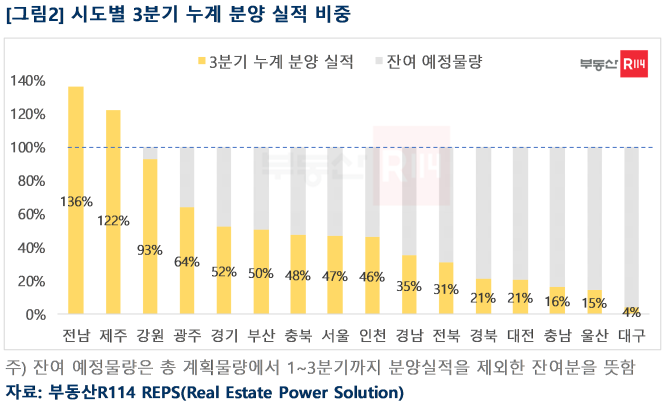 시도별 분양 실적을 살펴보면 전남과 제주는 이미 연간 계획물량 이상을 공급한 것으로 나타났다. 전남은 8~9월 광주연구개발특구 첨단3지구 공급물량으로 연내 예정물량을 초과 달성했고, 제주 지역도 7~8월에 692가구가 몰리며 분양 실적이 높았다. 반면 수도권은 3분기까지 연간 계획물량의 50% 내외로 공급됐으며, 누적 미분양 리스크가 해소되지 않은 대구, 울산 등은 분양시장 냉기가 이어지며 공급 재개에 조심스러운 분위기다.
