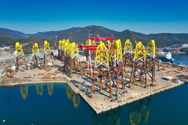| ▲SK오션플랜트 야드 전경 해상풍력 하부구조물 모습<사진제공=SK오션플랜트> |
