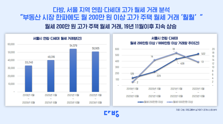 월세가 200만 원 이상인 고가 주택의 월세 거래는 2019년 11월부터 20년 10월까지 126건, 20년 11월부터 21년 10월까지 229건(81.7% 상승), 21년 11월부터 22년 10월까지 438건(91.3% 상승), 22년 11월부터 23년 10월까지 522건(19.2%)을 기록하며 꾸준히 상승세를 보였다.