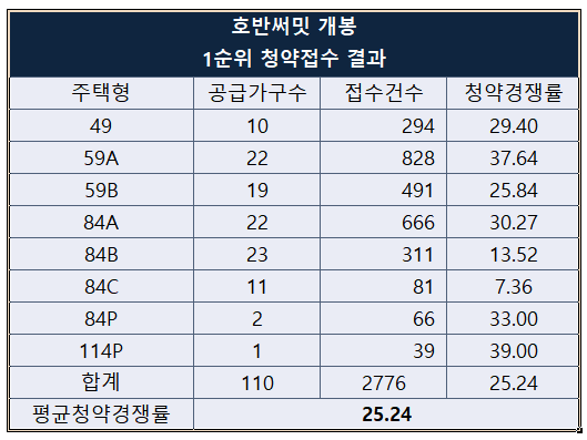 한국부동산원 청약홈에 따르면, 지난 5일 진행된 호반써밋 개봉의 1순위 청약 접수 결과, 특별공급을 제외한 일반공급 110가구 모집에 2,776명이 청약해 평균 25.24대 1의 경쟁률을 기록했다. 가장 인기가 높았던 주택형은 114㎡P타입으로 1가구 모집에 39명의 청약자가 몰려 39대 1로 마감됐다.