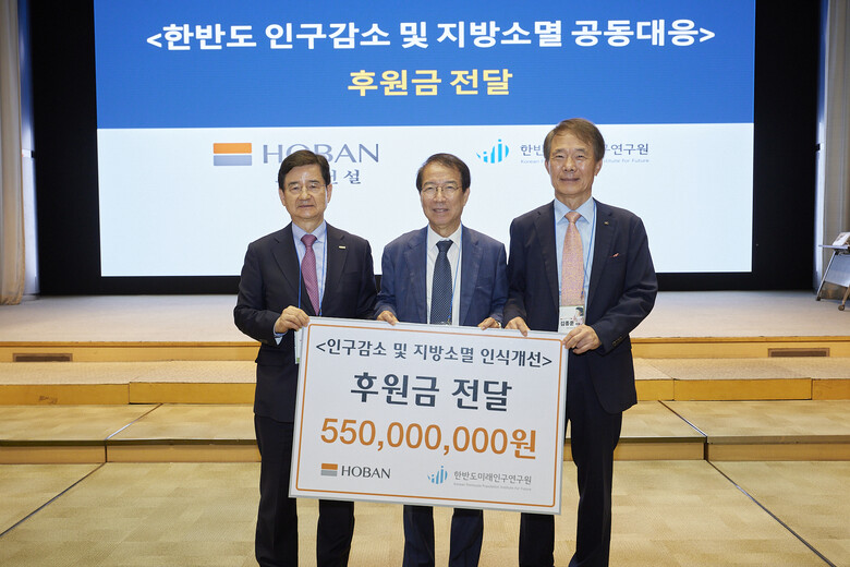 호반그룹은 우리나라 인구 감소와 지방 소멸 문제 해결을 돕기 위해 한반도미래인구연구원에 5억 5천만 원을 지원한다고 19일 밝혔다. 포스코센터에서 진행한 전달식에는 정운찬 한반도미래인구연구원 이사장, 김종훈 한미글로벌 회장, 김선규 호반그룹 회장 등 양측 관계자가 참석했다. 한반도미래인구연구원은 초저출산과 고령화 등 우리나라의 인구 문제에 대해 기업과 민간 차원에서 해결책을 모색하고자 발족된 비영리 연구기관이다.