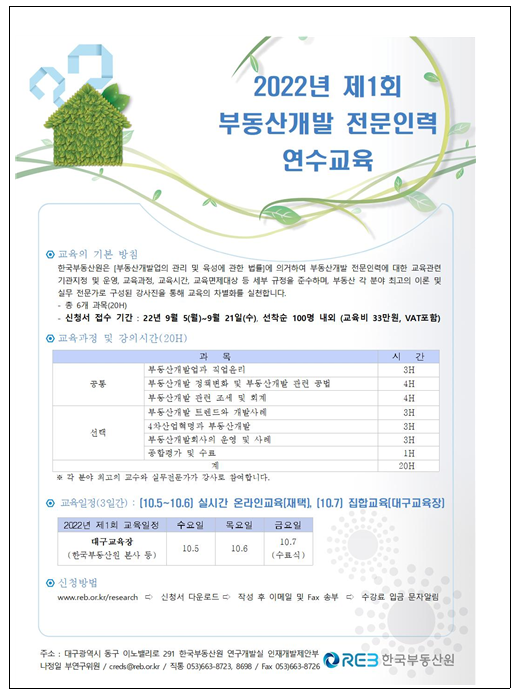 한국부동산원은 부동산개발 전문인력 역량 강화를 위한 '2022년 부동산개발 전문인력 연수교육'프로그램을 개설하고, 9월 21일까지 1회차 연수교육 수강생을 모집한다고 밝혔다.