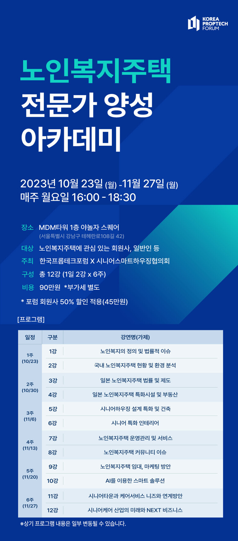 한국프롭테크포럼은 10월 23일부터 6주간 ‘노인복지주택 전문가 양성 아카데미’를 개최한다고 17일 밝혔다.