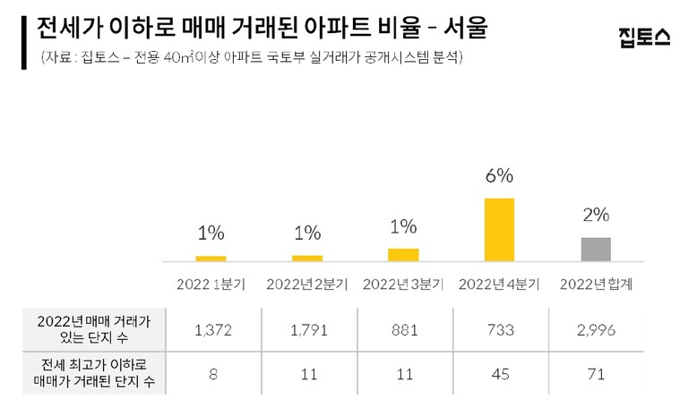 전세가 이하로 매매된 단지의 비율은 2022년 4분기 기준으로 39%로, 2분기 8% 대비 4배 이상 급증했다. 전용 40㎡ 이상의 아파트 실제 거래 중 해제된 거래와 직거래 실거래가는 제외한 수치다. 기존 전세 최고액은 2020년부터 2022년 사이에 체결된 각 아파트 면적별 전세 최고가를 기준으로 삼았다.
