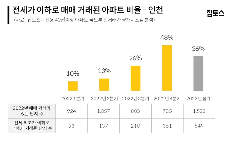 수도권 중에서는 인천 지역에서 전세가 이하로 매매 거래된 아파트의 비율이 36%로 가장 높게 나타났다. 인천 아파트 단지 1,522곳 중 549곳에서 기존 전세 최고가 이하로 매매 거래가 체결된 것이다. 2022년 4분기 기준으로는 48%에 달했다. 경기 지역은 2022년 기준 30%, 4분기 기준 45%로 인천의 뒤를 이었다. 서울은 2022년 기준 2%, 4분기 기준 6%로 비교적 깡통전세 아파트의 비율이 낮게 나타났다.