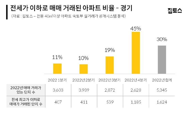 17일 부동산 중개업체 집토스가 서울과 경기, 인천 지역 아파트의 국토교통부 실거래가를 단지 및 면적별로 분석한 결과, 2022년에 매매 거래가 발생한 아파트의 23%에서 기존 전세 최고 가격 이하의 매매 거래가 일어난 것으로 나타났다. 아파트 단지 9,863곳 중 2,244곳에서 전세보증금 이하로 매매가 성사된 것이다.