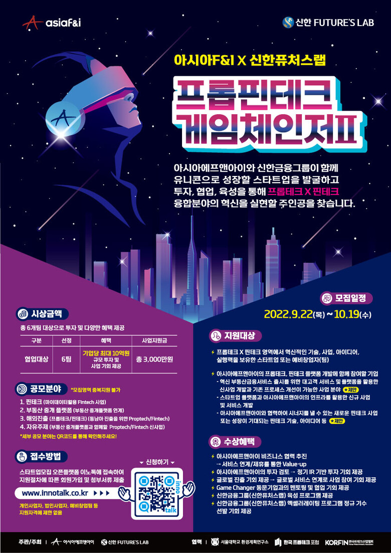 이번 공모전을 통해 아시아에 프앤아이와 신한퓨처스랩이 미래산업의 주역인 프롭테크 X 핀테크스타트업의 든든한 파트너가 되겠다는 게 공모 취지다.