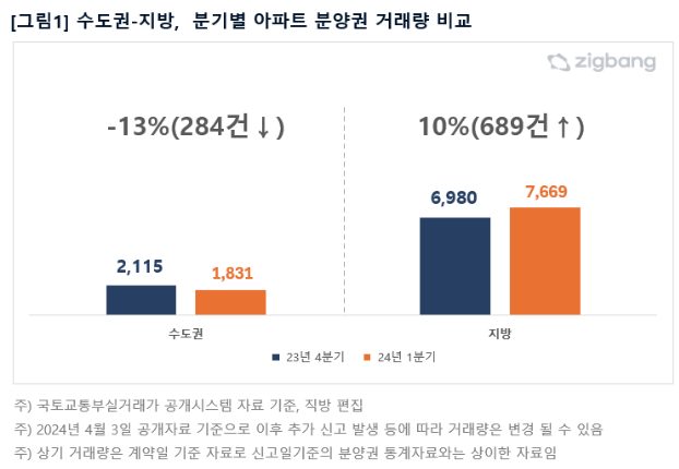 2024년 1분기 아파트 분양권 거래량이 늘어난 것으로 조사됐다. (주)직방이 국토교통부 실거래가 공개시스템에 제공된 계약일 기준의 아파트 분양권(입주권포함) 거래량을 분석한 결과, 2024년 1분기 전국 9,500건이 거래되며 직전 분기와 비교해 4%, 405건 증가한 것으로 집계됐다.