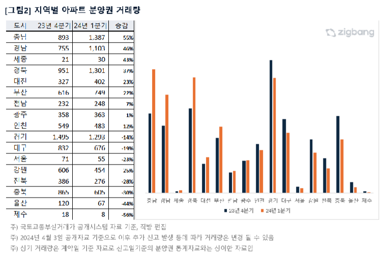 다음 경상남도의 거래량 증가가 컸다. 직전분기 755건 거래됐던 분양권 거래는 1,103건 거래되며 46%(348건↑) 늘었다. 더샵거제디클리브, 이편한세상거제유로스카이 등 입주아파트에서 등기 전 분양권 거래가 2024년 1분기 거래량 증가에 기인했다.