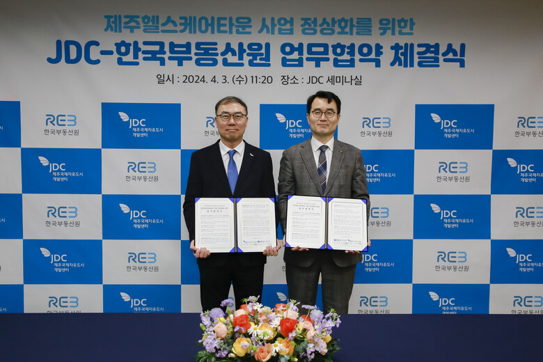 한국부동산원은 지난 3일 제주국제자유도시개발센터와 '제주 헬스케어타운 사업 정상화를 위한 업무협약(MOU)'을 체결했다고 밝혔다.