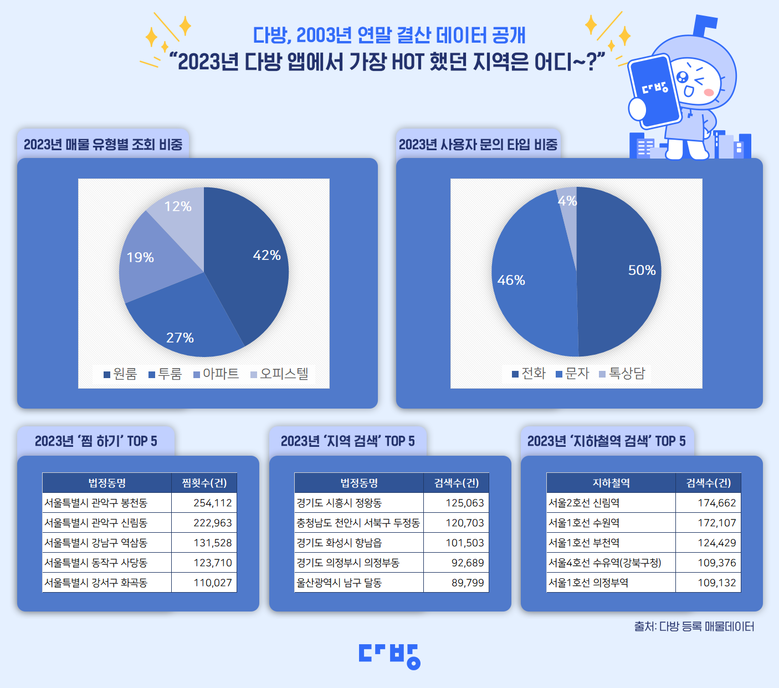 국내 최대 부동산 정보 플랫폼 ‘다방’을 운영하는 스테이션3는 2023년 1월부터 12월까지 1년 간 누적된 다방 앱 내 데이터를 바탕으로 한 2023년 연말 결산 데이터를 공개했다.