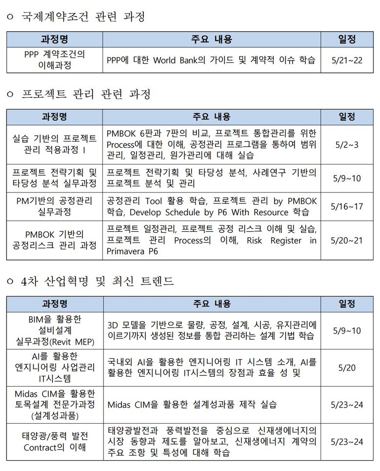5월에 진행되는 교육과정은 총 9개 과정으로 ▲ 국제계약조건 관련 1개 과정, ▲ 프로젝트 관리(PM) 관련 4개 과정, ▲ 4차 산업혁명 및 최신 트렌드 관련 4개 과정이 개설된다.