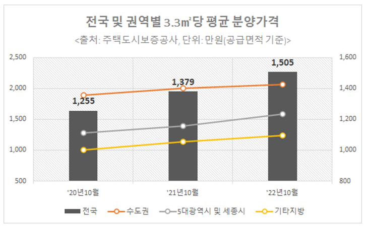 주택도시보증공사(HUG)에 따르면 분양가 상승세가 올해에도 계속되고 있다. 지난 10월, 전국에 공급된 민간아파트들의 평균 분양가격이 3.3㎡당 1,505만원에 달했다. 전년 동월(1,379만원) 대비 9.1% 상승한 수치다.
