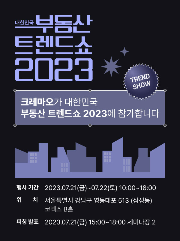 이번 부동산 트렌드쇼 2023에서는 데이터 생태계 조성을 위한 부동산 분야 빅데이터 플랫폼 및 센터 구축 사업이 주목 받고 있다. 이와 관련하여 프롭테크 기업들이 데이터 피칭 발표를 진행할 예정이다. 주거용 부동산 대표인 직방과 상업용 부동산 대표 오아시스비즈니스를 포함한 총 10개사의 발표가 예정하고 있으며, 피칭은 7월 21일 금요일 오후 3시부터 6시까지 코엑스 B홀 세미나장 2에서 진행된다. 오아시스비즈니스의 문욱 대표는 빅데이터 구축 사업에 상업용 부동산 대표 기업으로 참여하고 있으며, ‘Human eXperience DATA(인간 행동 데이터)를 통한 건설부동산 DX’라는 주제로 피칭을 진행할 예정이다. 이를 통해 부동산 분야에서 인간 행동 데이터를 활용한 혁신적인 접근 방식에 대한 크레마오의 이야기가 전해질 것으로 기대된다.