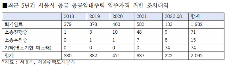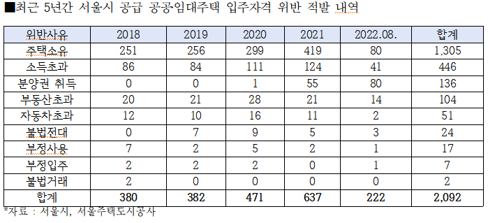 한편, 2018년부터 올해 8월까지 최근 5년간의 적발 건수로 살펴보면 전체 입주자격 위반은 총 2,092건으로 2천 건이 넘는 것으로 드러났다.