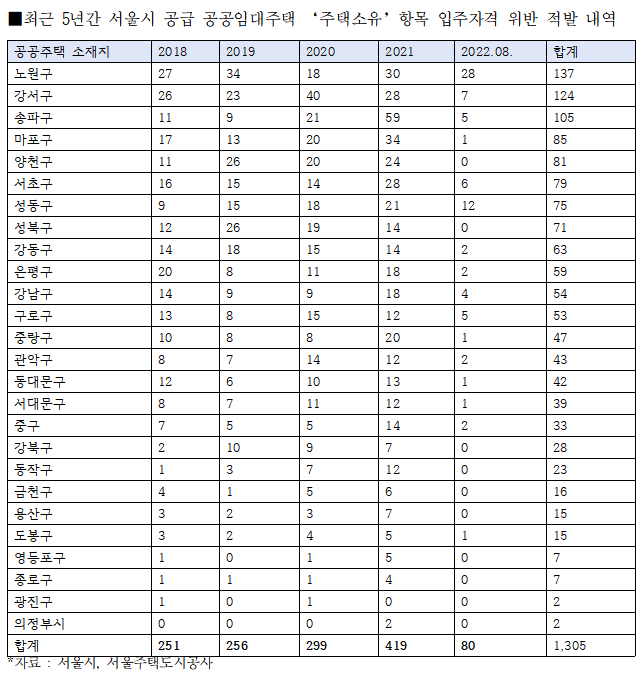 이 시기 적발 건수를 위반 사유 유형별로 살펴보면, 거주자의 주택소유에 따른 자격 위반이 1,305건으로 절반 이상 압도적으로 많았다. 주택소유 사례는 2018년에는 251건, 2019년 256건에 이어 2020년 299건을 기록한 뒤, 지난해에는 419건으로 폭증했다.