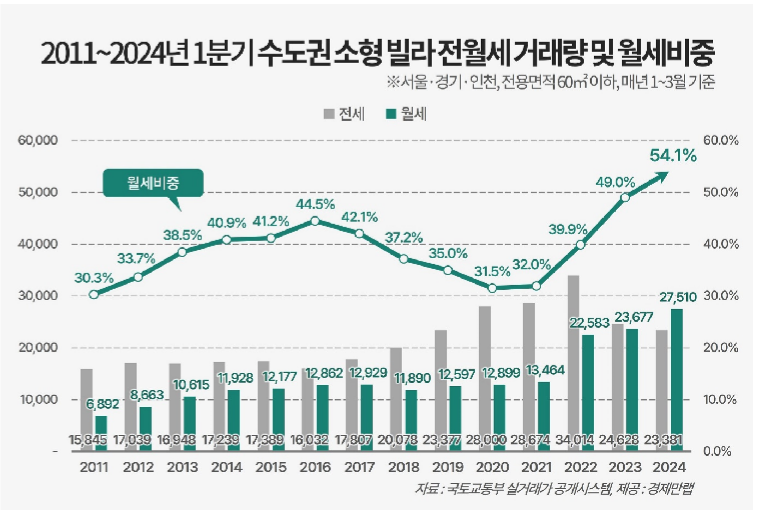 1분기 수도권 소형 빌라, 월세 비중 54.1%…"역대 최고치"
