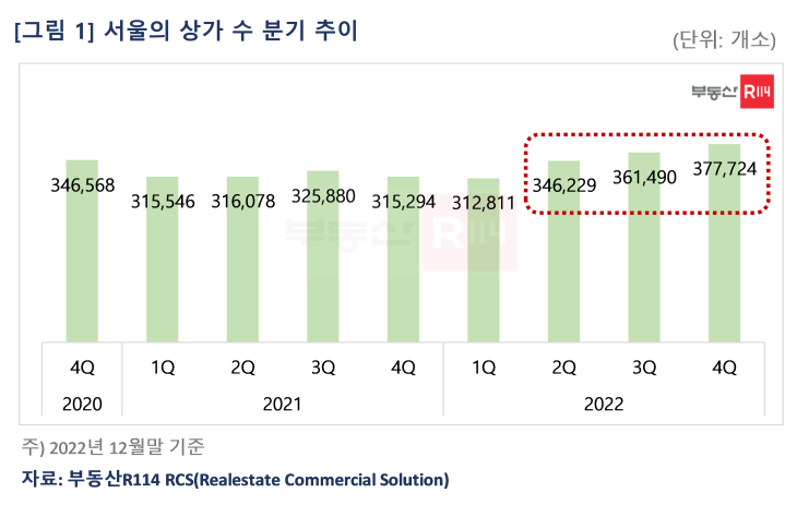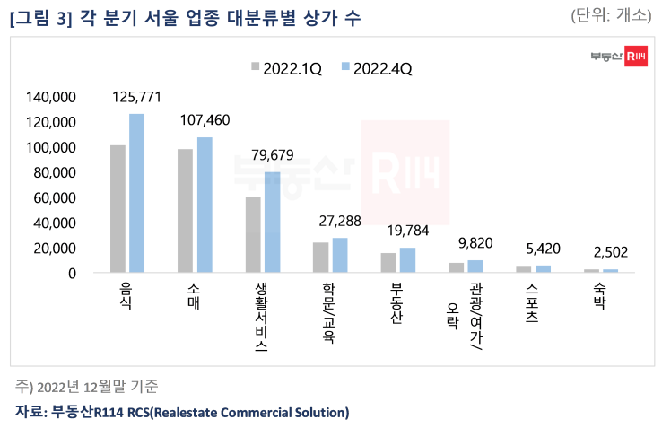 사회적 거리두기가 해제된 2022년 2분기부터 상가가 꾸준히 증가세를 나타내면서 서울 상권이 회복되는 분위기다. 특히 소득 및 소비수준이 높고 유동인구가 풍부한 강남권 등 업무지구에서의 증가세가 두드러졌다. 일상생활에 필요한 생활서비스, 음식점 위주로 늘어나면서 상가시장은 지역별 혹은 업종별로 온도 차를 보였다.