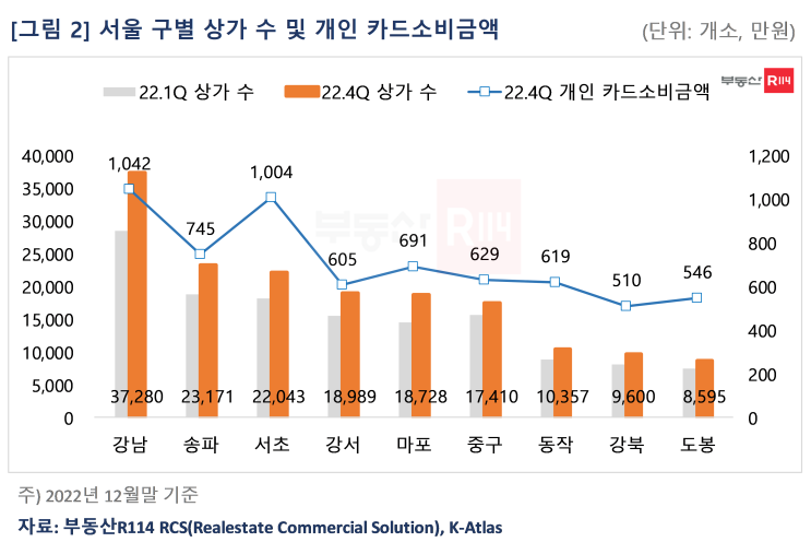 부동산R114의 상업용 부동산 솔루션 ‘RCS(Realestate Commercial Solution)’를 통해 서울의 상가 업종별 추이를 분석한 결과, 2022년 2분기부터 상가 수가 꾸준히 늘어난 것으로 조사됐다(2022.2Q 34만6,229개소→3Q 36만1,490개소→4Q 37만7,724개소). 서울 전 지역에서 상가 수가 증가한 가운데 특히 강남3구, 강서, 마포 등 업무시설이 밀집하고 유동인구가 많은 지역에서 크게 늘었다. 이 중 개인 카드소비금액이 약 1,000만원(4분기) 수준으로 높은 강남3구(강남, 서초, 송파)의 경우, 2022년 1분기와 비교해 4분기 상가가 1만7,259개소 증가했다. 반면 상대적으로 소비 수준이 낮고 주거수요가 대부분인 도봉, 강북은 상가 수와 증가폭이 타 지역에 비해 낮았다.