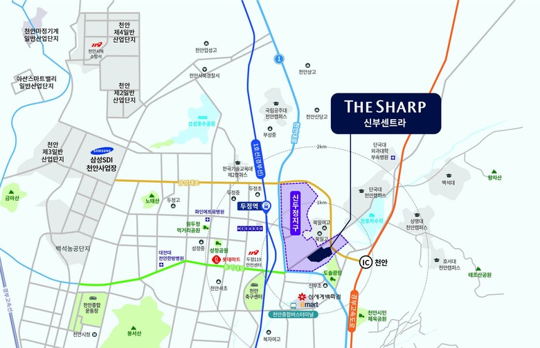 ‘더샵신부센트라’는 도심권에 위치해 교통여건도 우수하다. 1호선 두정역과 천안IC 인근 천안고속터미널 및 천안종합터미널과 가까워 편리한 교통망을 이용할 수 있다. 이외에도 삼성SDI, 천안 제2,3일반산업단지 등 다수의 산업단지도 가까워 직주근접 프리미엄도 누릴 수 있다.