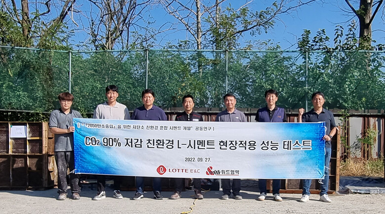 롯데건설이 ‘2050 탄소중립’ 정책을 실현하기 위해 친환경 건설 신소재 기술개발 벤처기업인 위드엠텍과 함께 기존 콘크리트 대비 탄소 배출량을 최대 90%까지 저감할 수 있는 친환경 콘크리트를 개발에 성공했다.