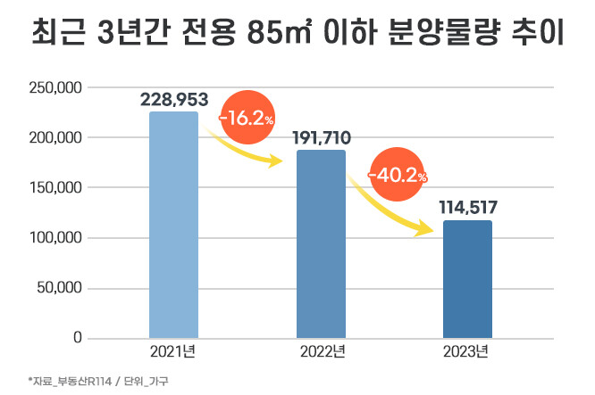 부동산 정보제공업체 부동산R114의 자료에 따르면 지난 한 해 전국 분양시장에서 전용면적 85㎡ 이하의 중소형 아파트는 전년 대비 40.2%가 줄어든 11만4,517가구가 공급된 것으로 조사됐다. 이는 2021년에서 2022년 16.2%가 감소한 것과 비교해 2배 이상 감소폭이 커진 것으로, 분양시장이 본격적인 활황기를 맞은 2015년 이후 가장 적은 물량이다.