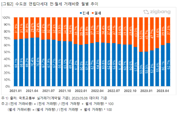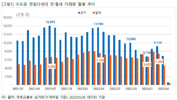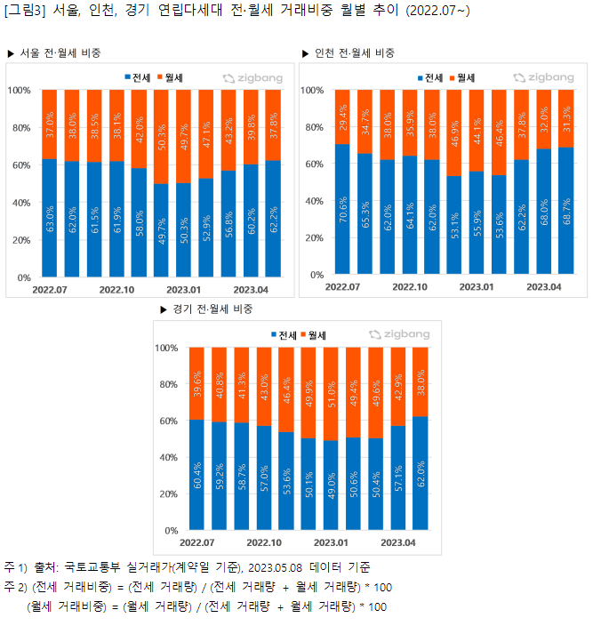 서울을 비롯한 수도권 지역의 연립다세대 전세 거래비중이 월세 거래비중에 비해 다시 커지고 있다. 지난해 기준금리 인상으로 인해 전세대출 금리 역시 크게 상승함에 따라 2022년 5월 이후 전세 거래량이 지속적으로 감소해왔다. 게다가 대규모 전세사기 피해사례가 속출하면서 2022년 12월, 2023년 1월에는 연립다세대 전세 거래량이 월세 거래량과 비슷한 수준으로 줄었다. 2023년 2월부터는 다시 전세 거래가 늘어나면서 전세와 월세 거래량 차이가 다소 벌어지고 있다.