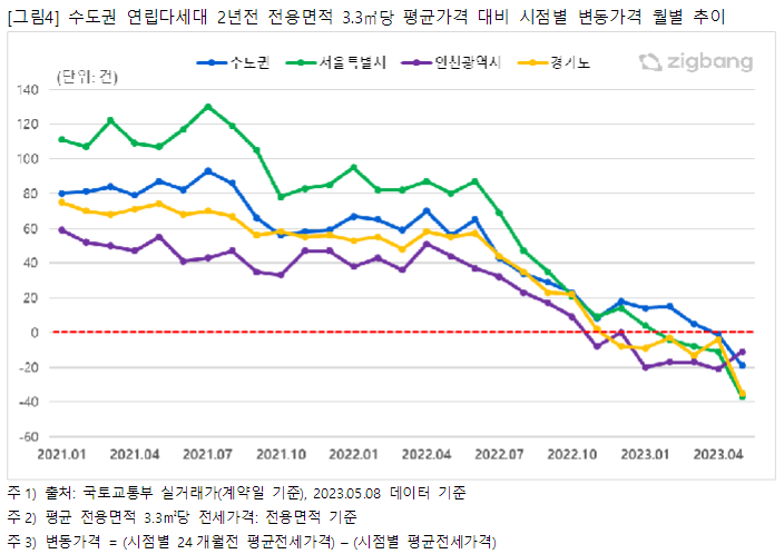 그러나 2022년 11월에는 인천 전세가격이 평균 224만원으로 2년전 평균 가격인 232만원보다 3.3㎡당 8만원 더 낮은 금액으로 거래되어 평균 거래가격이 떨어졌음을 확인할 수 있다. 이어 2022년 12월에는 경기 지역 평균 전세가격이 313만원으로 2년전 평균 가격(321 만원/3.3㎡)보다 3.3㎡당 8만원 낮은 금액에 거래되었으며, 서울지역은 2023년 2월 평균 550만원에 거래되며 2년전보다 4만원 낮은 가격을 기록하며 감소세를 보이고 있다. 최근 수도권 연립다세대주택의 전세가격 하락으로 임대차 계약 2년차 갱신이 도래한 주택은 역전세 가능성이 커졌다.