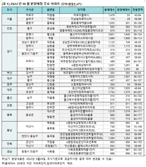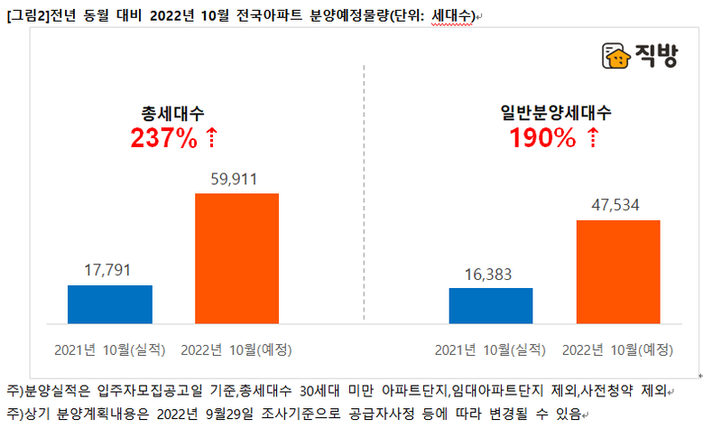 2022년 10월에는 74개 단지, 총세대수 5만9,911세대 중 4만7,534세대가 일반분양을 준비하고 있다. 2021년 동월 물량과 비교해 총세대수는 4만2,120세대(237%증가), 일반분양은 3만1,151세대(190%증가)가 더 분양될 예정이다.