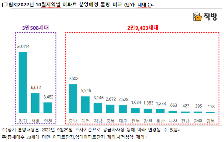 10월 전국에서 공급하는5만9,911세대 중3만508세대가 수도권에서 분양 준비중이다. 경기도가 2만414세대로 가장 많은 공급이 계획되어 있다. 지방에서는 2만9,403세대의 분양이 계획되어 있으며, 충청남도에서 9,602세대로 가장 많은 공급이 이루어질 전망이다. 이번에 조정대상지역 지정이 해제된 지역의 공급세대수는 전국 예정물량 중 31%를 차지한다.