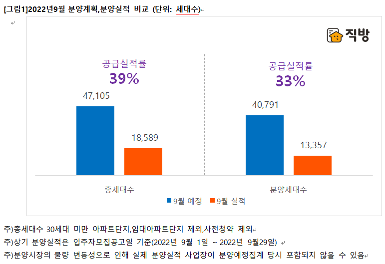 지난 8월말에 조사한 9월 분양 예정 단지는 71개 단지, 총 4만7,105세대, 일반분양 4만791세대였다. 이를 재조사한 결과 실제 분양이 이루어진 단지는 24개 단지, 총 1만8,589세대(공급실적률39%), 일반분양 1만3,357세대(공급실적률33%)가 분양 됐다.