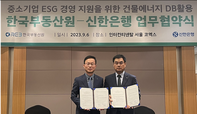 한국부동산원은 지난 6일 신한은행과 함께 '중소기업 ESG 경영지원을 위한 건물에너지 DB 활용 업무협약'을 체결했다고 밝혔다.