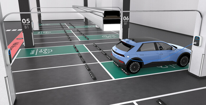 | ▲주차면 상부 중앙에 구축된 광폭 케이블 덕트를 통해 전기차 충전기를 설치한 모습<자료제공=현대건설> |