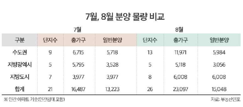 당초 계획됐던 8월 분양물량은 총 3.3만여 가구(일반 2.3만여 가구) 가량이었으나 분양 일정들이 변동되면서 예정보다 줄어들었다(8월 1주 집계 기준).