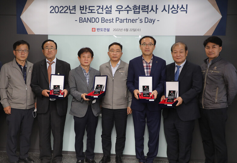 반도건설은 서울 강남구 테헤란로 7길에 위치한 본사에서 반도건설 이정렬 시공부문 대표 및 임직원들과 우수 협력사로 선정된 총 22개사 중 최우수 4개사 협력사 대표 등이 참석한 가운데 ‘2022년 상반기 우수 협력사 시상식(BANDO Best Partner’s Day)을 개최하고 감사패와 기념품을 전달했다.