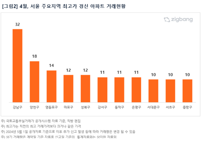 다음 양천구가 18건이 4월 최고가 경신 아파트로 집계됐다. 목동신시가지 개발기대와 신생아특례대출 등 저리 대출을 활용한 소규모 단지의 간헐적인 거래 영향으로 보인다. 다음 영등포구 14건, 마포구 12건, 성북구 12건, 강서구 11건, 동작구 11건, 은평구 11건 순으로 최고가 경신 아파트가 많았다.