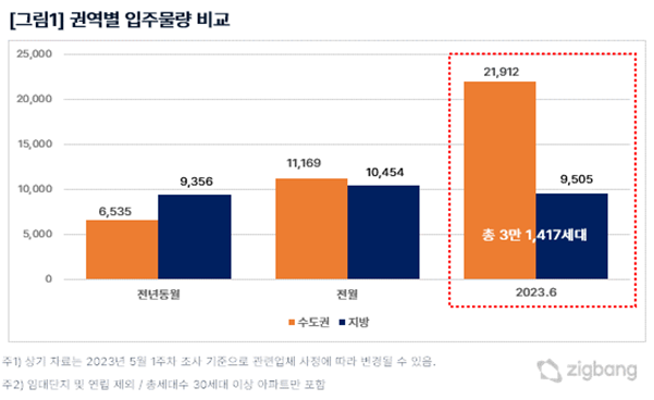 권역별로는 수도권이 2만 1,912세대, 지방이 9,505세대로 수도권 비중이 높다. 수도권의 경우 전월 대비 2배 가량, 전년동기보다 3배 이상 많다. 2개월 동안 입주물량이 없었던 서울에서 4,833세대가 입주하고 경기는 과천, 수원 등지에서 6,371세대가 입주한다. 특히 인천은 1만 708세대가 입주할 예정으로 2007년 8월(1만 1,207세대)이후 가장 많은 물량이 공급된다.