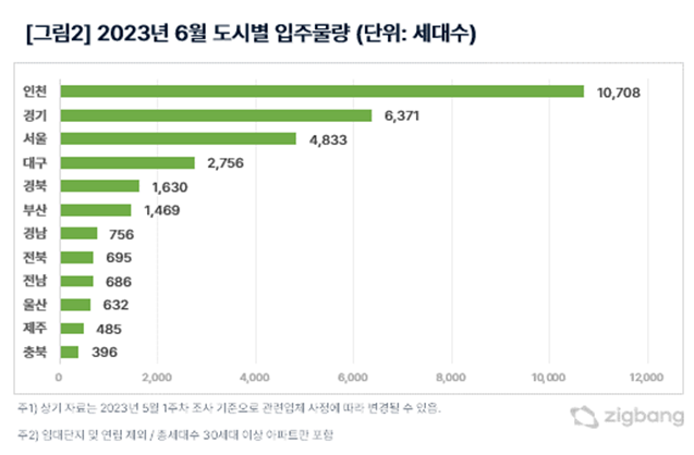 지방은 전월보다 9% 가량 적은 9,505세대가 입주하며 대구 2,756세대, 경북 1,630세대, 부산 1,469세대 등 순이다.