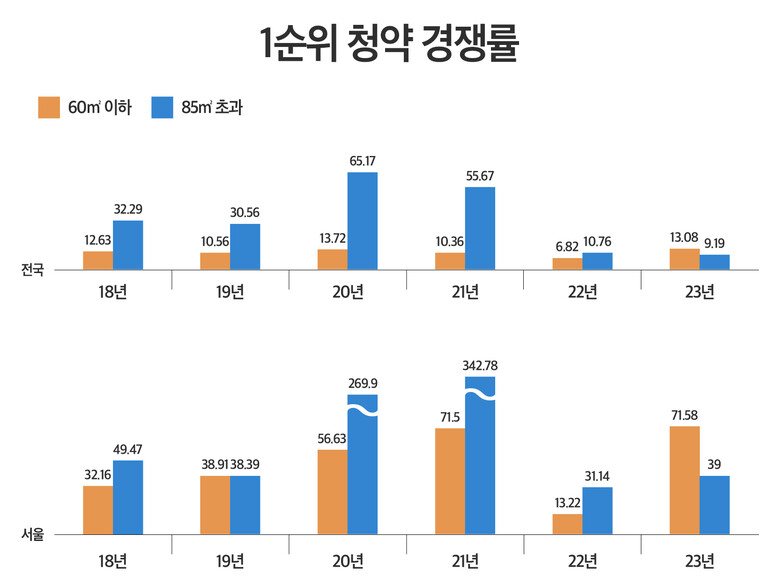 부동산인포가 부동산R114(렙스) 데이터를 분석한 결과 올해(7월 기준) 전국에서 전용면적(이하 전용면적) 60㎡이하 1순위 청약 경쟁률은 13.08대 1로 나타났다. 85㎡초과 9.19대 1, 60~85㎡이하 7.02대 1을 웃돌았다. 특히 서울은 60㎡ 이하가 71.58대 1을 기록해 85㎡초과 39.00대 1, 60~85㎡이하 61.67 보다 치열했다.
