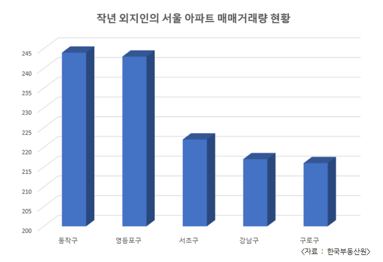 한국부동산원 자료에 따르면 2022년 외지인의 서울 아파트 매매거래량은 총 3,425건으로 조사됐다. 이 가운데 동작구가 244건, 영등포구 243건, 서초구 222건 등의 순으로 전체 거래량의 20.70%를 차지했다.