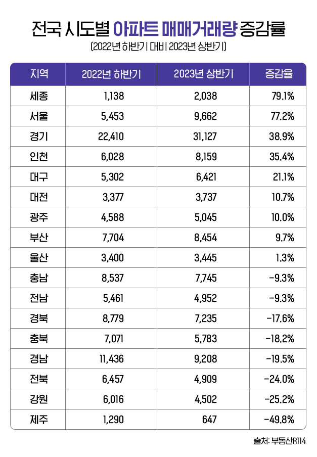 지역별로 보면 서울과 세종의 증가세가 두드러진다. 세종시는 작년 하반기 1,138건에서 올 상반기 2,038건으로 약 79.1%가 증가했으며, 서울 역시 5,453건에서 9,662건으로 약 77.2% 증가하며 두 도시가 전국에서 가장 큰 폭의 증가세를 보였다. 경기도(38.9%), 인천(35.4%), 대구(21.1%), 대전(10.7%), 광주(10%), 부산(9.7%) 등이 전국 평균을 웃돌았다.