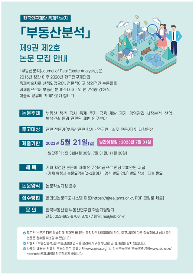 논문은 온라인논문투고시스템(https://ejrea.jams.or.kr)을 통해 접수 가능하며, 자세한 사항은 부동산분석 홈페이지(www.ejrea.org) 또는 한국부동산원 부동산연구원 홈페이지(www.reb.or.kr/research) 공지사항을 참조하면 된다.