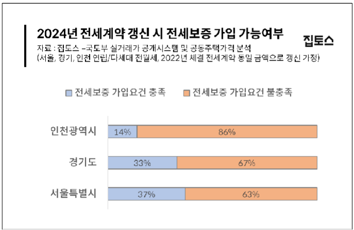 2일 부동산 중개업체 집토스가 서울과 경기, 인천 지역의 국토교통부 연립·다세대 전월세 실거래가와 주택 공시가격을 비교 분석한 결과, 2022년 체결된 연립 다세대 전세 계약의 66%가 동일한 금액으로 2024년에 계약을 갱신할 경우 전세금 반환보증에 가입하지 못하는 것으로 나타났다. 2024년부터 변경되는 전세보증 가입요건인 담보인정비율 90%를 초과하는 것이다. 이는 근저당권 등 선순위 담보채권이 아예 없는 것을 가정한 수치로, 일부 선순위 채권이 있을 것을 감안하면 전세보증 가입이 불가한 주택은 더 많을 것으로 예상된다.