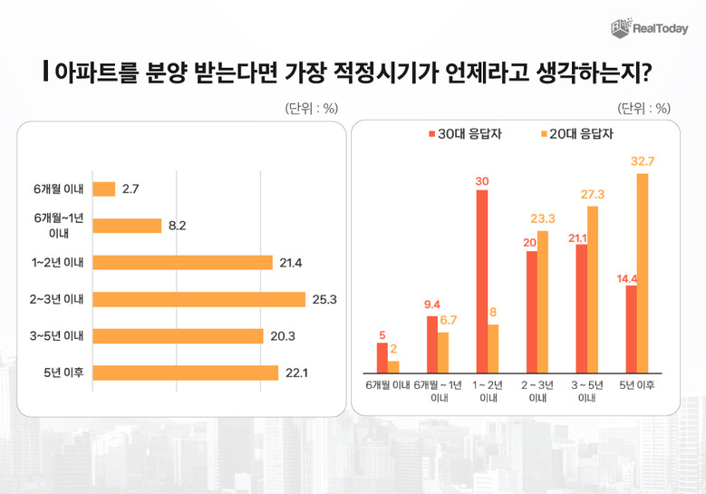 해당 질문에서는 20대와 30대의 의견이 극명하게 갈리기도 했다. 20대는 분양 적정시기를 ‘5년 이후’(32.7%)로, 30대는 ‘1~2년 이내’(30%)로 가장 많이 선택했다. 40대, 50대, 60대는 모두 ‘2~3년 이내’를 꼽았다.