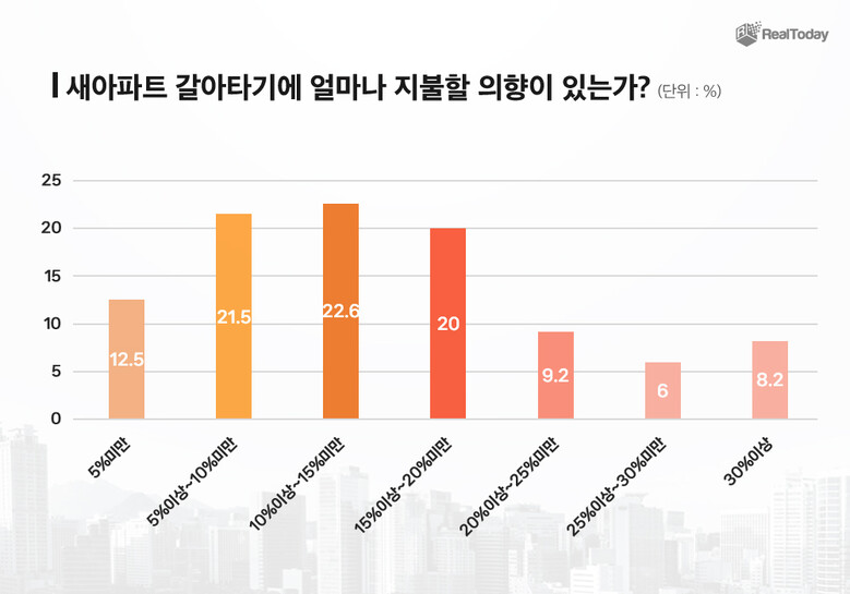 실제로, 10년차 아파트에서 동일한 입지 여건의 새 아파트로 갈아탈 경우, 얼마까지 추가 지불할 의향이 있는가에 대한 질문에 가장 많은 응답자가 ‘10% 이상~15% 미만’(22.6%)을 선택했다. 다음으로 '5% 이상~10% 미만’(21.5%), '15% 이상~20% 미만’(20%) 순으로 나타났다. ‘30% 이상’ 지불할 의사가 있다는 응답자도 8.2%에 달해 새 아파트에 대한 니즈는 충분히 높았다.