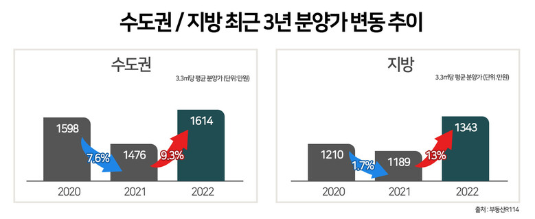 부동산R114 자료에 따르면, 올해(1~9월 기준) 수도권 3.3㎡당 평균 분양가는 1,614만원으로 2021년 1,476만원 대비 9.3% 올랐다. 이는 2020년(1,598만원) 대비 2021년 7.6% 하락한 것과 비교해 크게 뛴 것이다. 지방(수도권 제외)의 경우도 올해 1,343만원으로, 2021년 1,189만원 대비 13% 오른 반면, 직전 2020년(1,210만원)은 1.7% 하락했다.