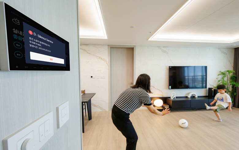 D-사일런스 서비스는 공동주택 거실과 세대 팬트리 벽면에 설치한 센서를 통해 일정 수준 이상의 진동이 감지되면 월패드로 자동 알림을 보내준다. 환경부 공동주택 층간소음 기준(39㏈(A)) 이상의 소음을 발생시키는 바닥 진동이 10초에 3회 이상 발생 시 ‘주의’ 알림을, 10초에 6회 이상 발생 시 ‘경고’ 알림을 자동으로 울린다.