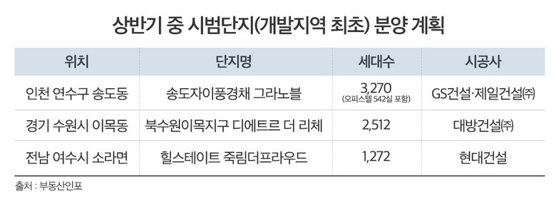 시범단지가 높은 인기를 구가하는 가운데, 올해 상반기 공급을 앞둔 단지들이 화제다. 부동산 정보업체 부동산인포 자료에 따르면 송도와 수원, 여수 등에서 시범단지 분양이 대규모로 추진되고 있다.